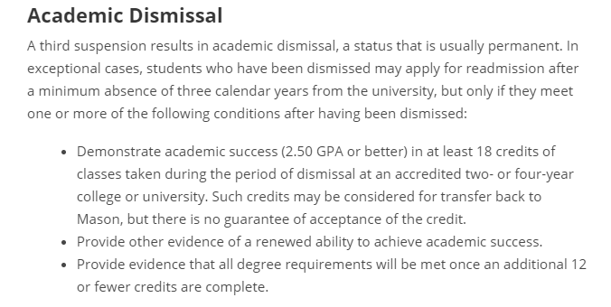 从停学中readmission回学校的学生在第一个学期内将被放置在留校察看的状态。在Mason停学期间(学术或非学术原因)在其他学校获得的课程学分不被Mason任课;值得一提的是,在第三次停学导致开除,这种状态通常是永久性的。