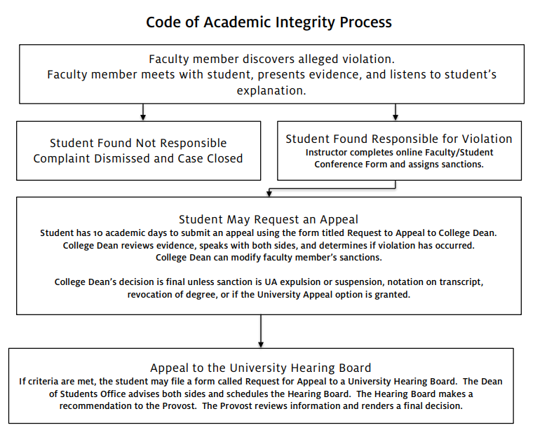 在收到处分通知后,学生可以在10个工作日内向学院院长提出申诉(appeal)。院长会审查证据,与双方交谈,并确定学生是否发生了违规行为,院长的决定是最终决定。当学生收到了从UA停学、开除,成绩单标注不诚信行为或学位撤销的处分,可以继续向学校教务长申诉。