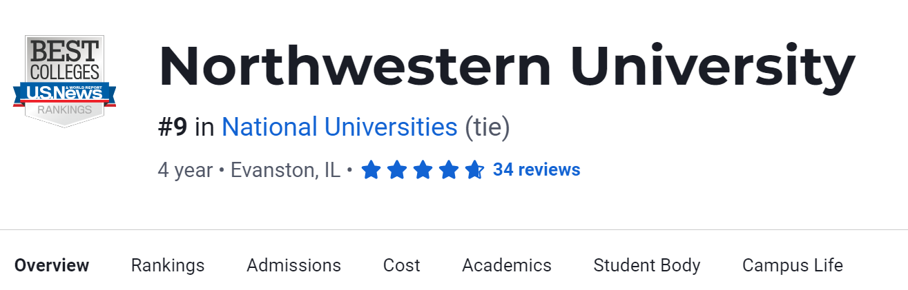 在2024年USNews美国大学排名中,西北大学排名第9。