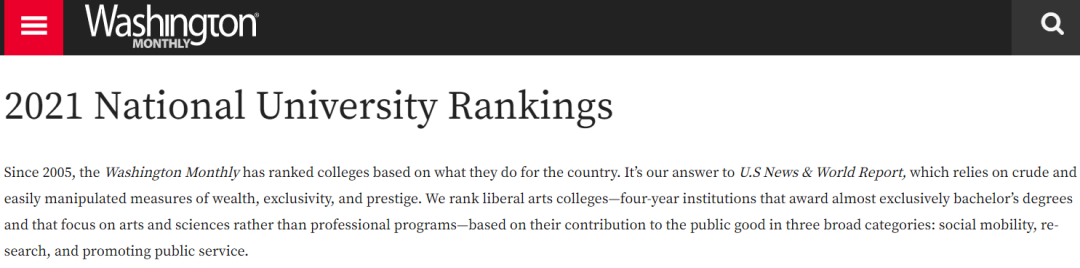 跟USNews不同的是,华盛顿月刊更侧重于对大学的研究、服务和社会流动性的考查。