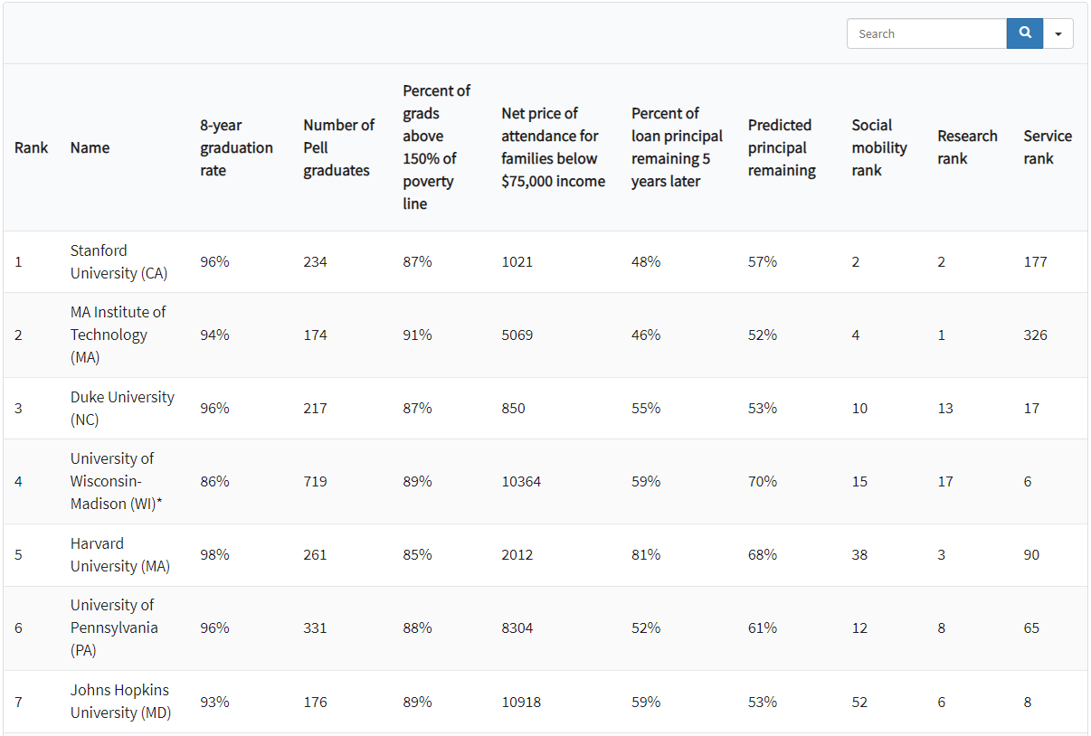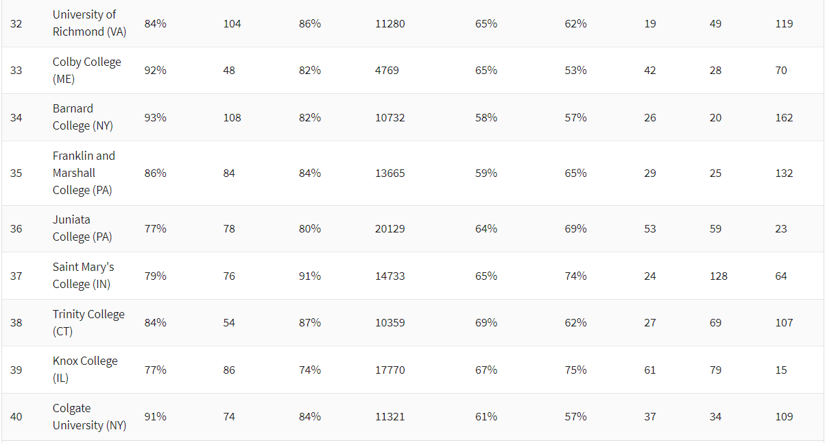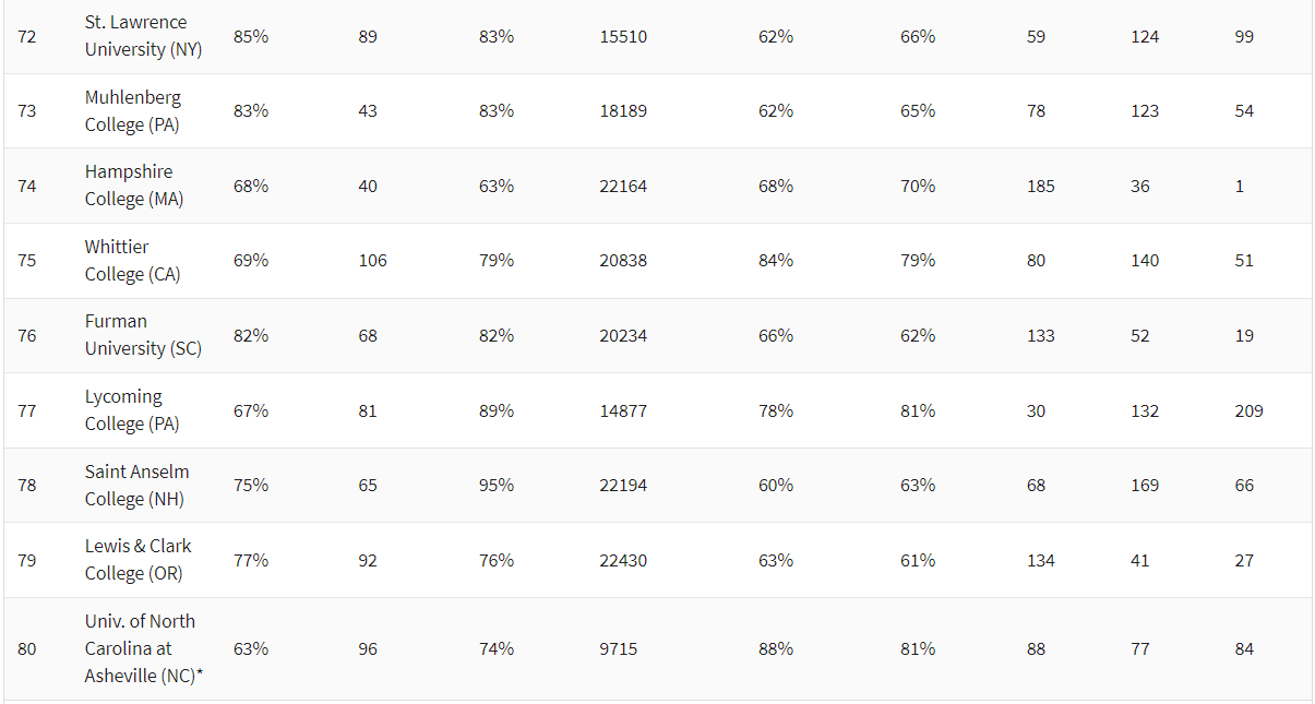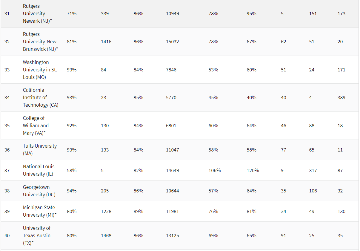 究其原因,还是由于这份排名与U.S.News相比,更加注重“性价比”。可以看到,U.S.News中的顶尖私立大学,比如西北大学、布朗大学、约翰霍普金斯大学、纽约大学,虽然综合实力强大,但是在录取率上却长期以来较低且学费较高,因此在《华盛顿月刊》中只分别排在后面。