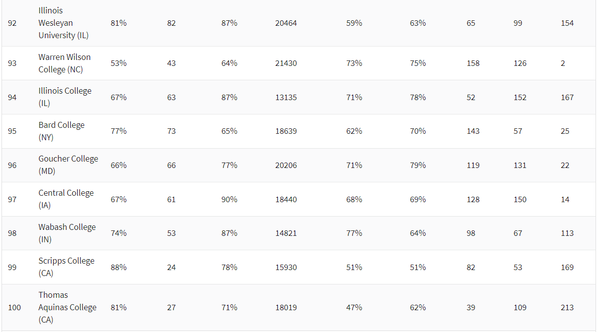 在本次排名中,《华盛顿月刊》一共分四种榜单:综合大学、文理学院、硕士大学和学士学院。以下是四个榜单详细排名: