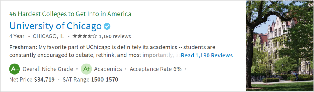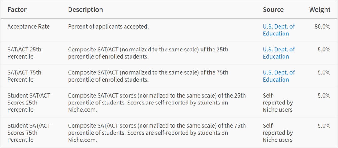 此次排名基于美国各大高校公布的最新录取率、SAT/ACT考试成绩,以及美国教育部(U.S. Department of Education)的数据统计而成。Niche 降低了 ACT/SAT分数的权重,以应对美国大学在录取过程中普遍不再重视考试分数的变化。