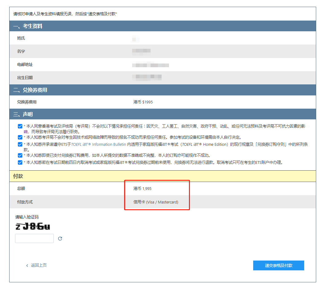 4.核对资料,无误后填写验证码提交付款,付款金额是港币1995,付款方式是信用卡VISA和MasterCard。