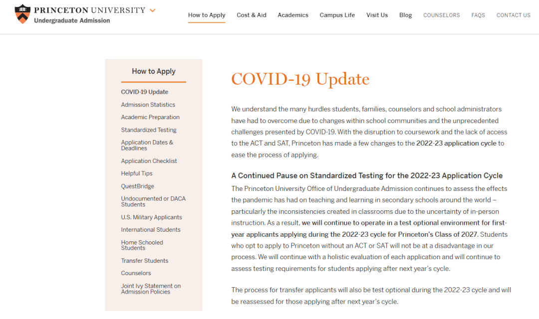 普林斯顿大学本科招生办表示:考虑到疫情对世界各地中学教学的影响,在没有ACT/SAT成绩的情况下,申请普林斯顿的学生不会处于不利地位,会继续对每个申请进行全面评估。同时,在2022-23学年期间,转学申请者也适用“标化可选”政策。