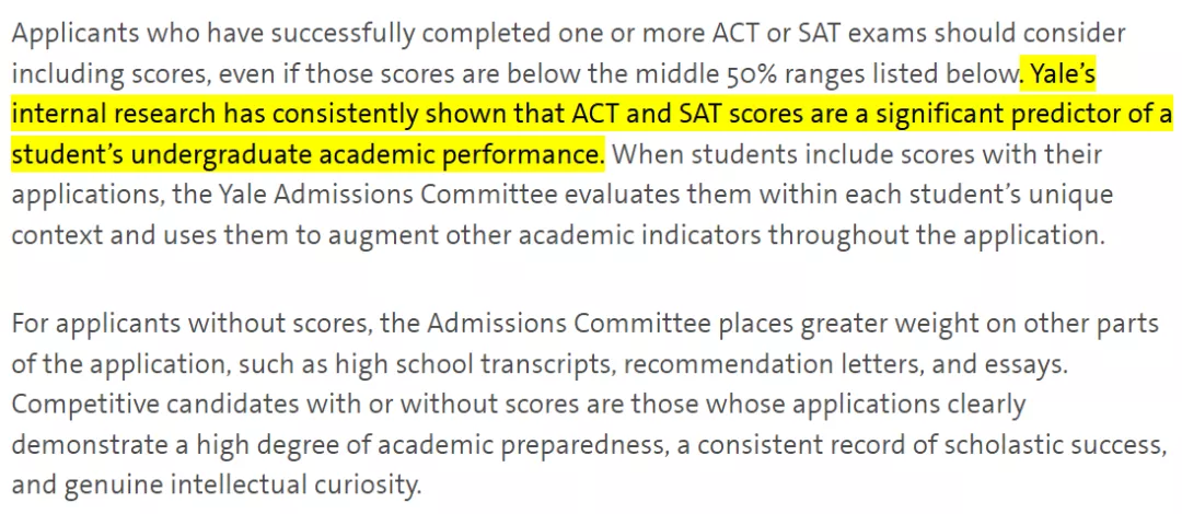 耶鲁在招生网明确指出:耶鲁大学的内部研究表明,ACT和SAT分数是学生学业成绩的重要预测指标,所以标化可选属于大学因人性化采取的无奈之举。如果学生提交SAT/ACT的考试成绩,将更有利于招生官们对学生学术能力的判断。