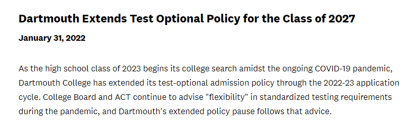 达特茅斯学院2023申请季延续标化成绩可选政策。