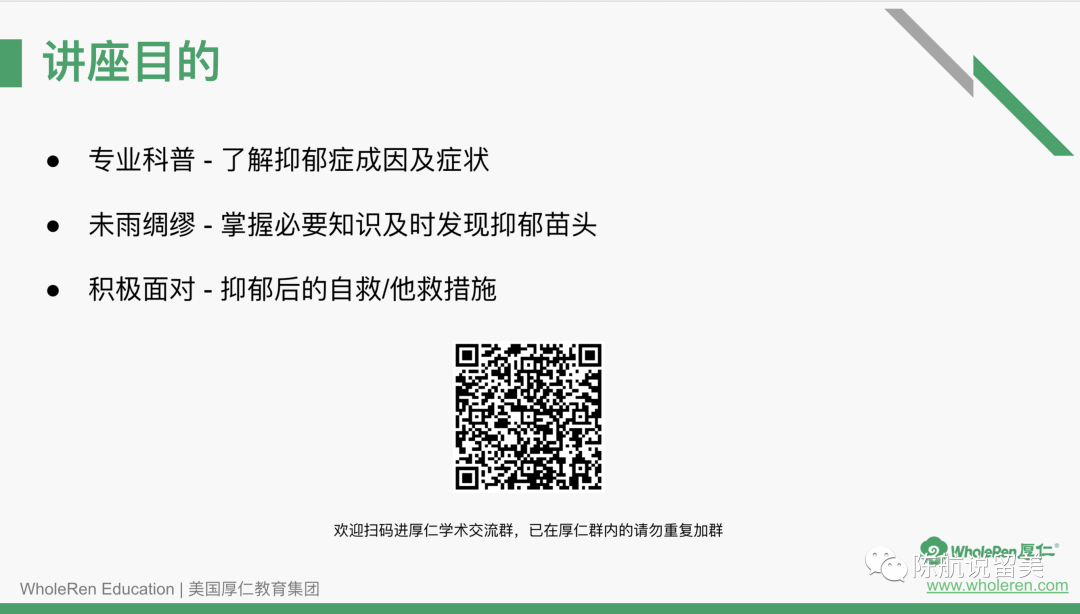 许多留学生因不适应美国的环境、文化,或学业跟不上等等问题,产生抑郁情绪。尤其疫情期间患抑郁症的留学生大大增加。希望这次讲座可以帮助到留学生及其家长们。