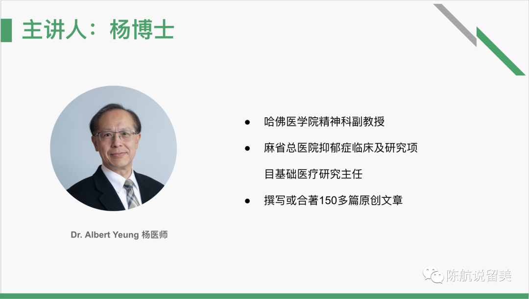 感谢各位家长同学观看周六的《抑郁症的发现和治疗》讲座,本次讲座的特邀主讲人杨博士,是哈佛医学院精神科副教授,也是麻省总医院抑郁症临床研究主任,具有非常丰富的精神领域经验。