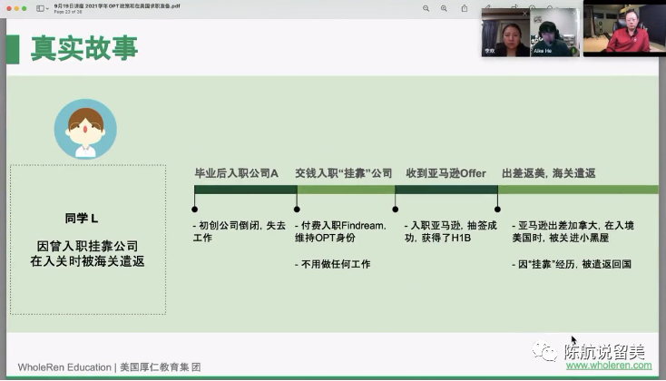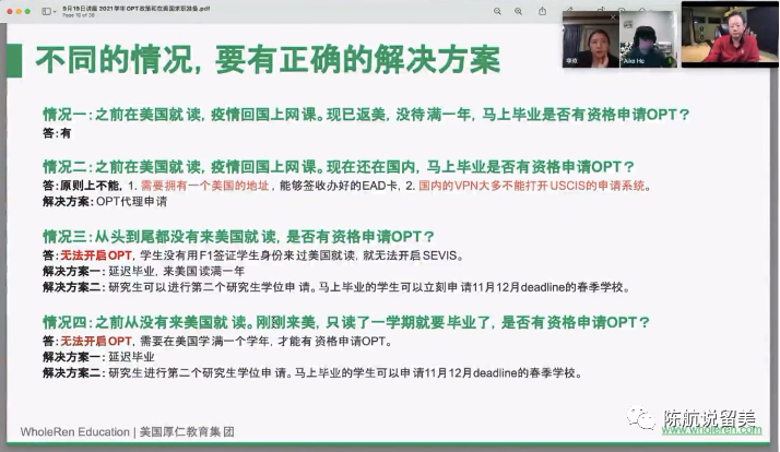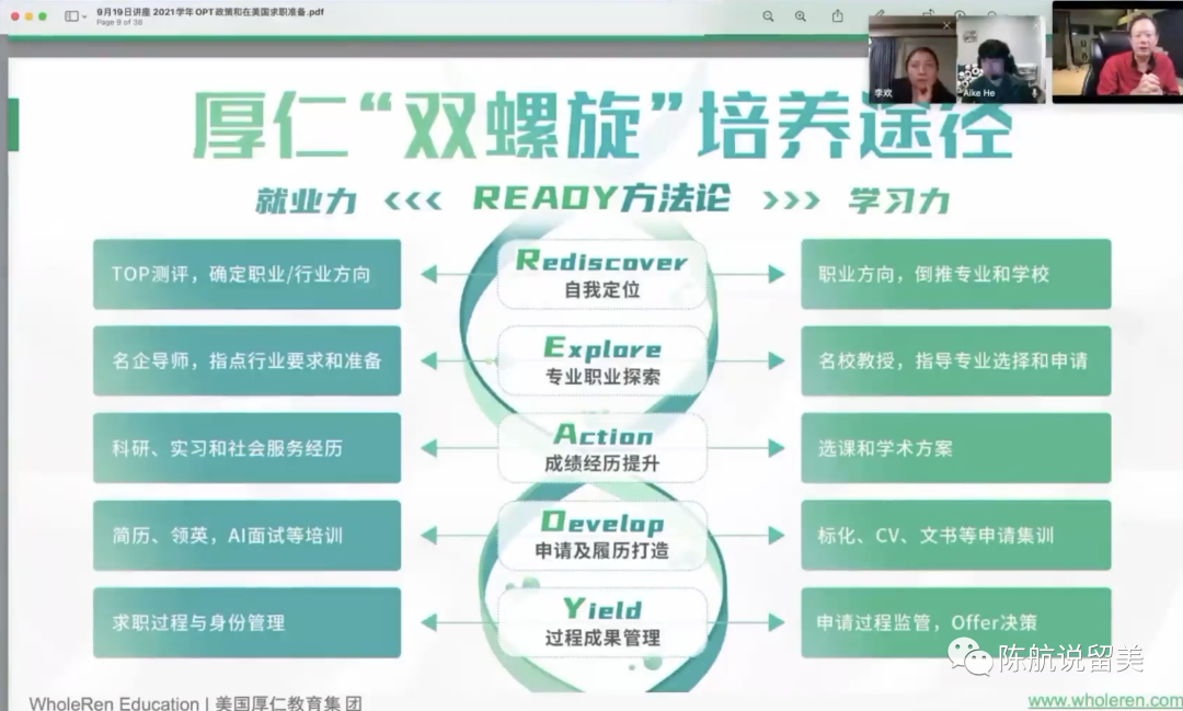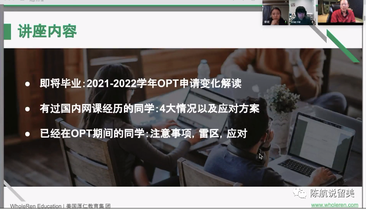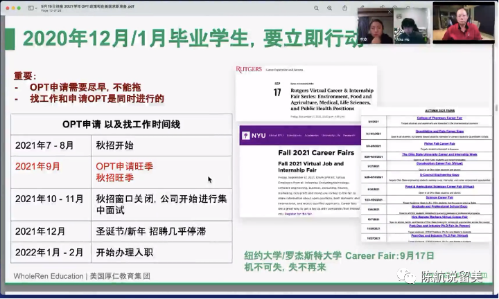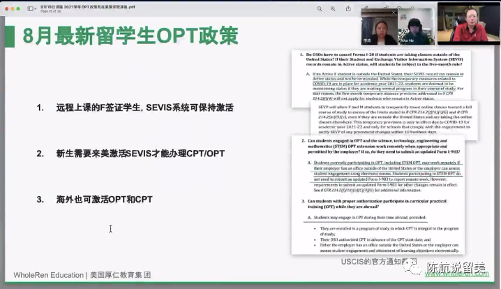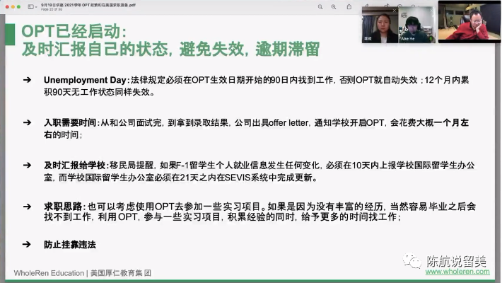 感谢各位家长同学观看9月19日的《最新OPT政策和找工作注意事项》讲座,本次讲座的特邀生涯发展规划专家李欢老师和OPT专家Aike老师为大家解读2021-2021最新OPT政策和应对措施。