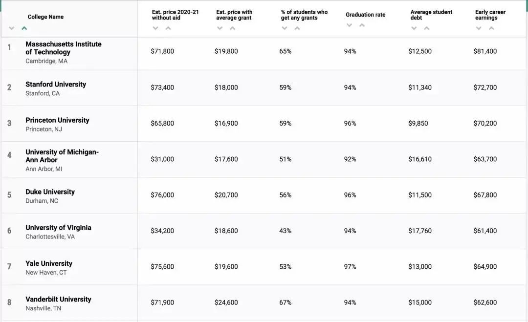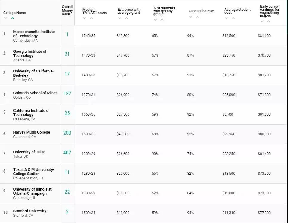 从上面的排名中我们可以看出工科强校都位居了前列。而以文商科为优势的院校,比如哈佛大学,在“性价比”的综合排名上,竟然未进Top 10。