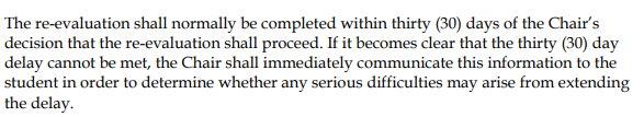 在与任课老师沟通后,如果学生认定自己的成绩依然存在错误或者异议没有得到解决,学生有权利提交正式的Re-evaluation。关于成绩的Re-evaluation,学生应当提交至课程所在院系的系主任并附上申请的理由和相应的支持性材料。这里特别注意的是每个学期的Re-evaluation申请截止日期:秋季学期不晚于2月1号,冬季学期不晚于6月15号,夏季学期不晚于10月1号。在收到学生的成绩申诉后,学院通常会在30个工作日内做出答复。