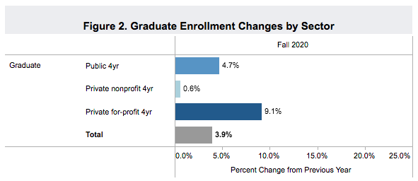 我们可以看到,私立营利性四年制大学的研究生入学人数上升高达9.1%,公立四年制大学的这一比例为4.7%。