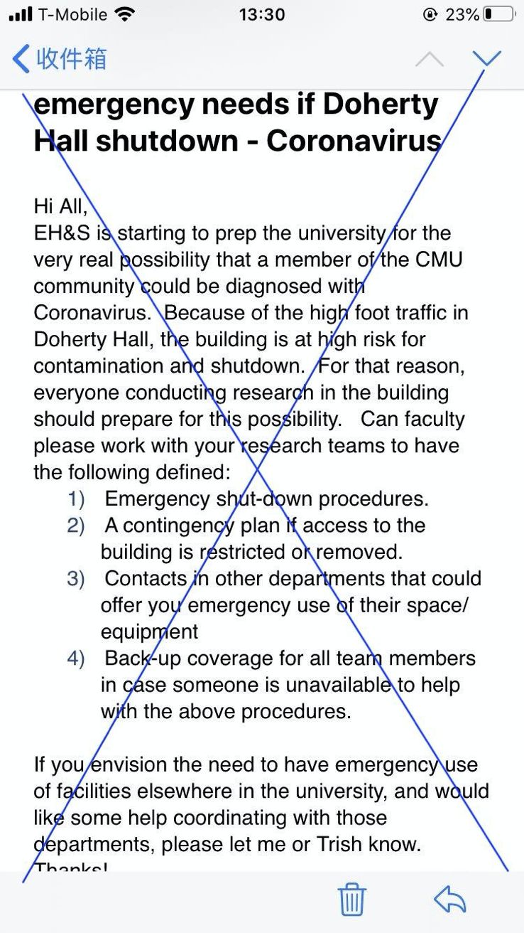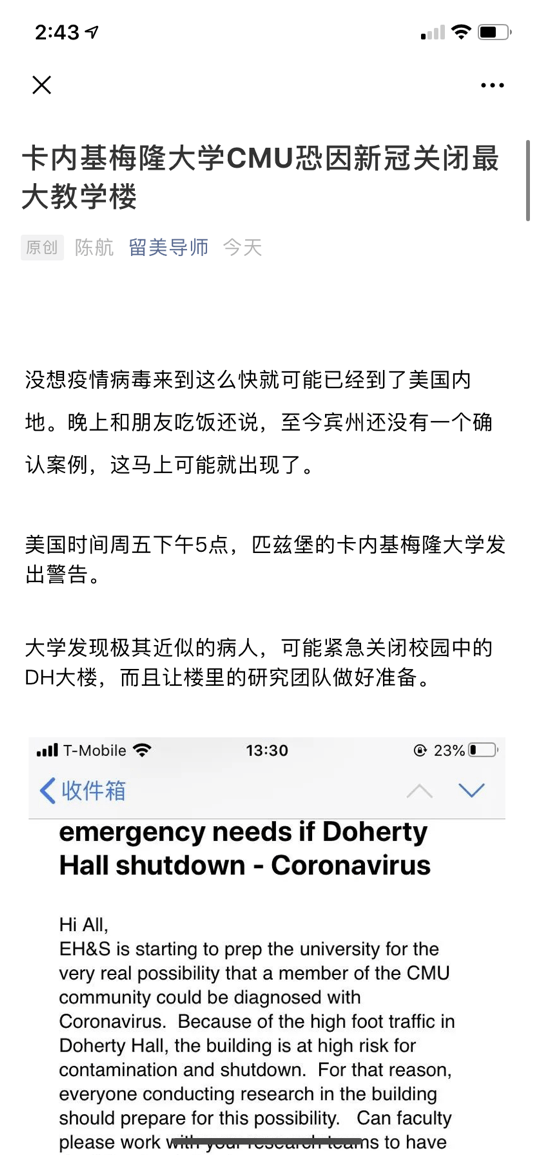 周五晚上收到一个电邮截屏,说CMU很可能有人确诊冠状病毒,大学可能马上关闭一个最大的教学科研楼DH大楼。