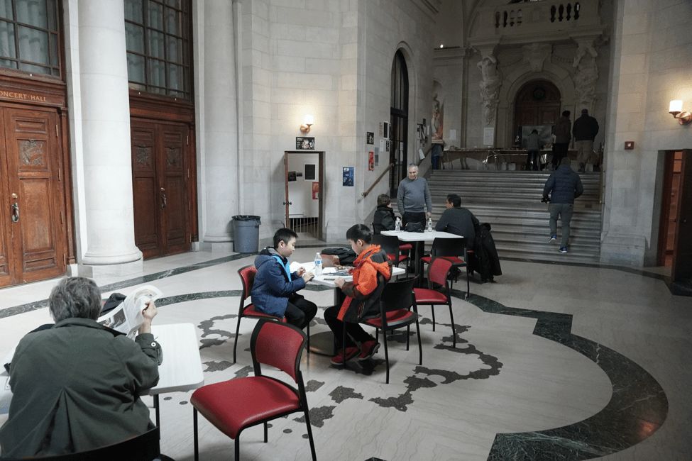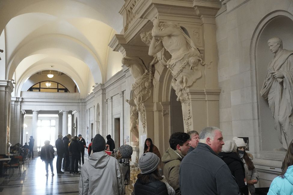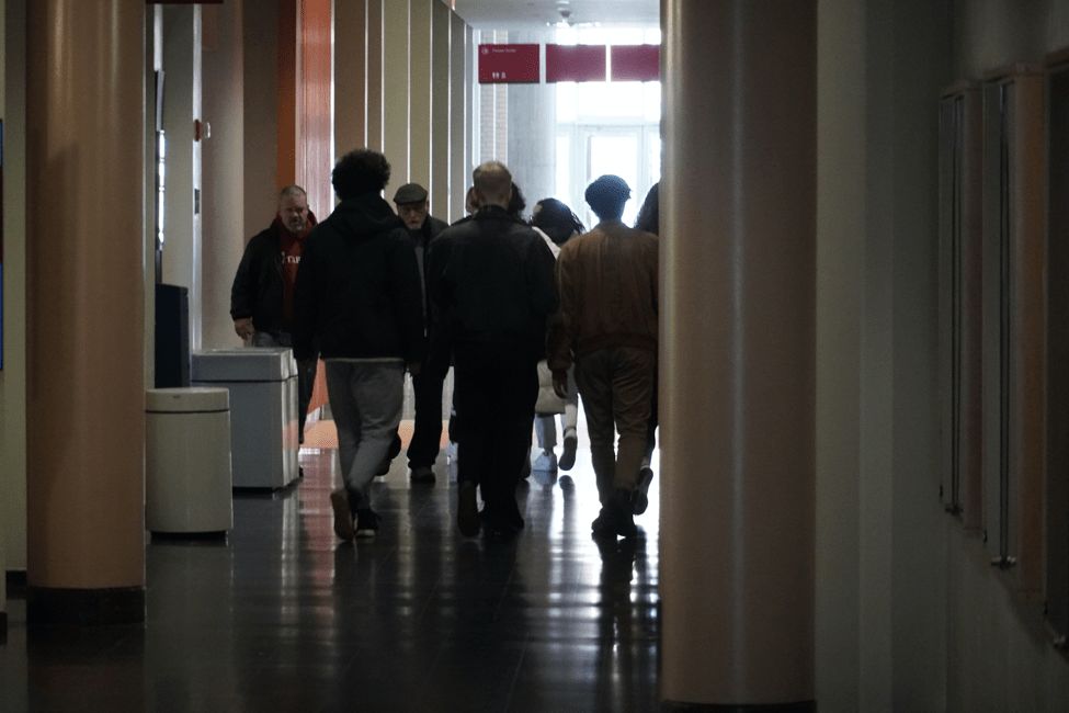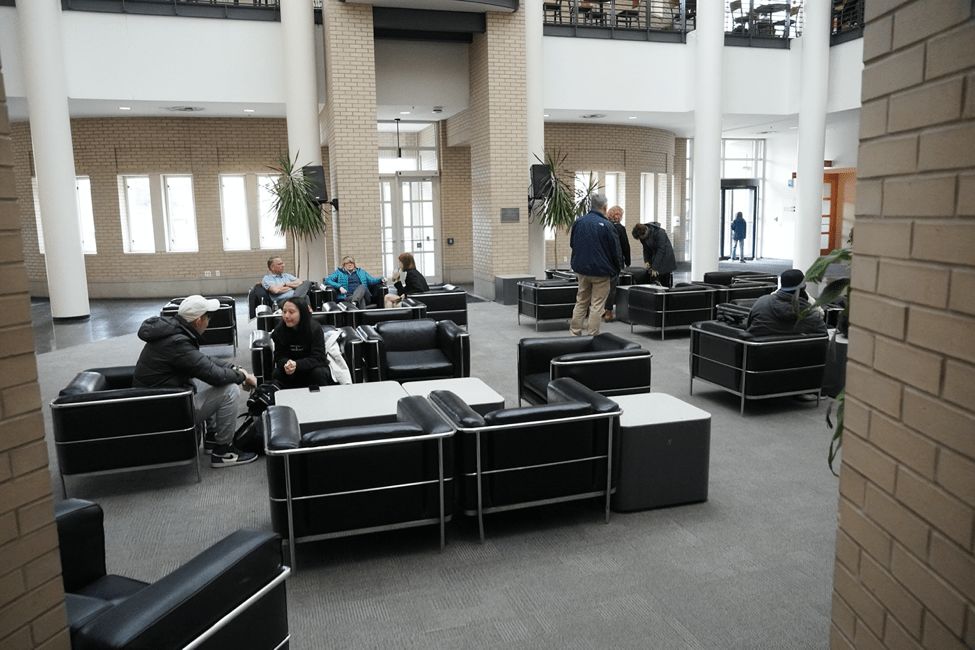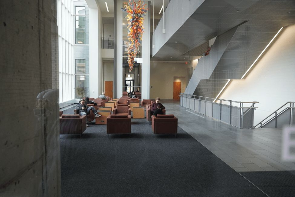 大学中心的大厅,很多人在交谈。