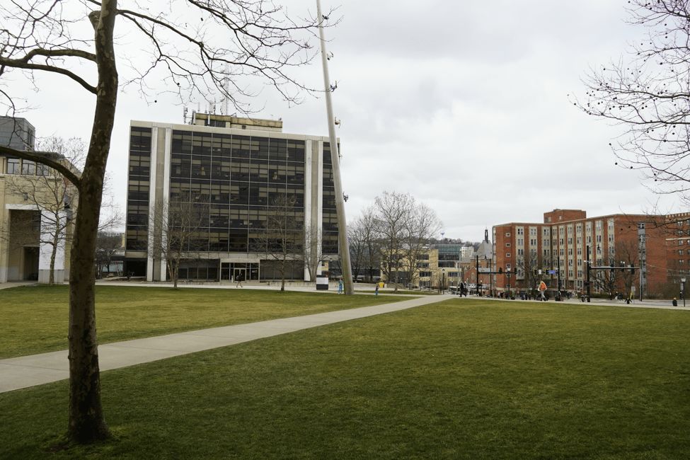 站在艺术大楼前,后面是CMU的大草坪,还有匹兹堡大学的主楼。