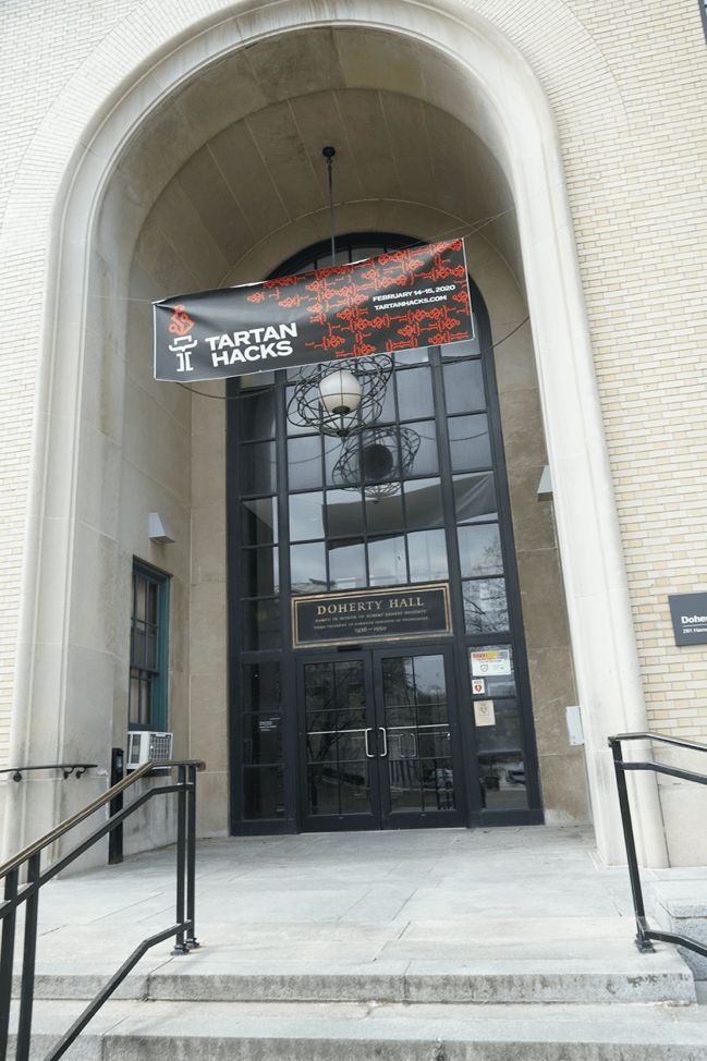 DH大楼正门。上面挂的标语,写的就是 CMU 黑客。这个假的电邮,兴许就是黑客臭小子们做的。