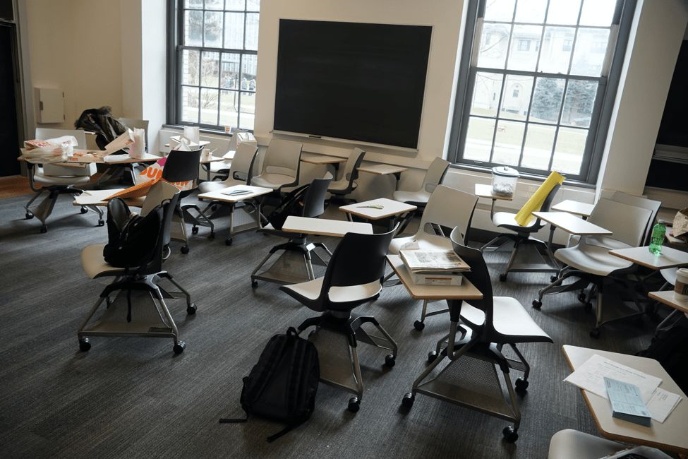 教室门口,里面有人在工作。