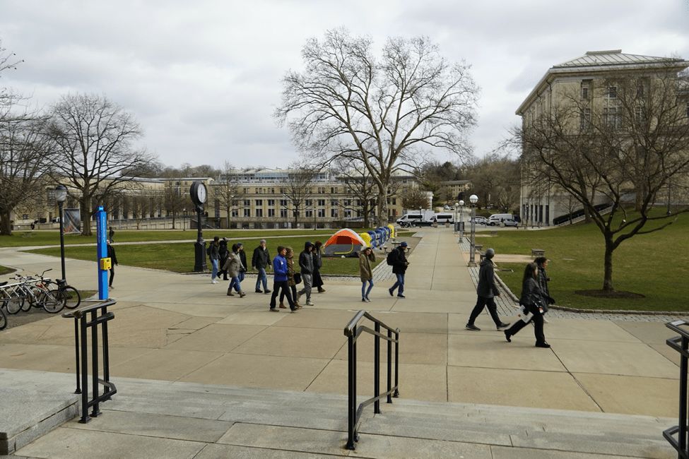 校园中央的访校团。背景的帐篷后面说。
