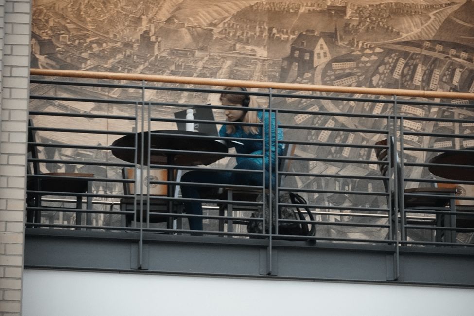 女生在二楼学习。CMU,课业很重,学霸很多。