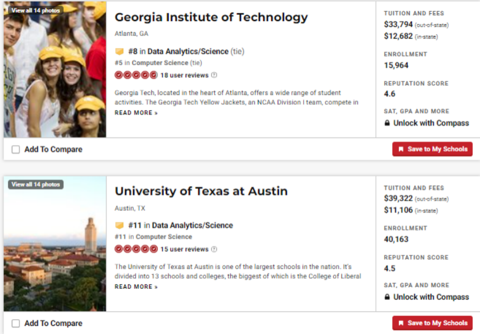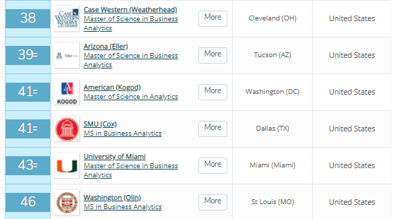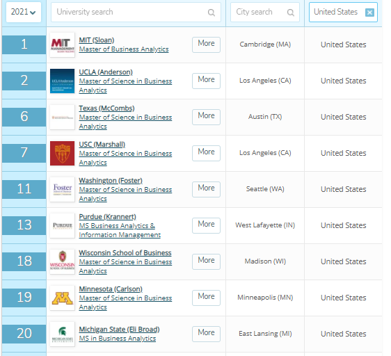 – MIT、UCLA、Texas、USC占据了全球最佳商业分析项目的前10