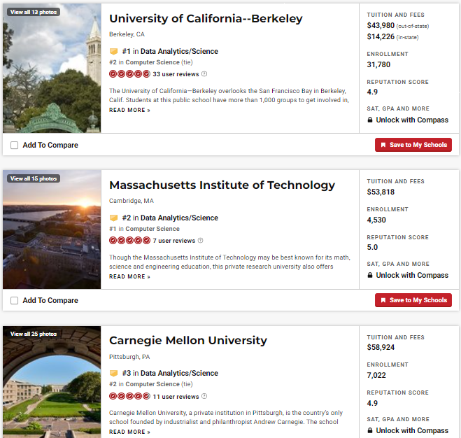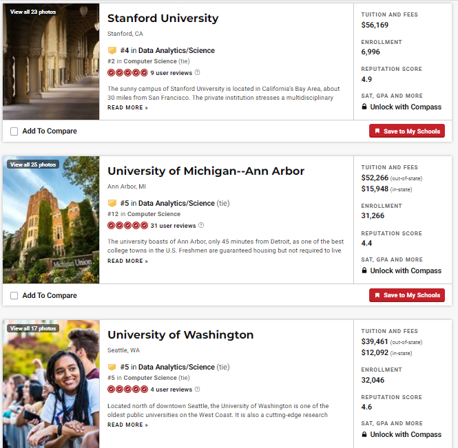 那么在US NEWS中也有DS专业本科项目的排名,当然也有很大一部分同学会在硕士申请DS方向,而在研究生项目中,哈佛的DS项目则是全美第一,纽大、哥大、斯坦福、宾大、杜克、布朗、康奈尔、南加大、卡内基梅隆、乔治城等大学也都是非常好的选择: