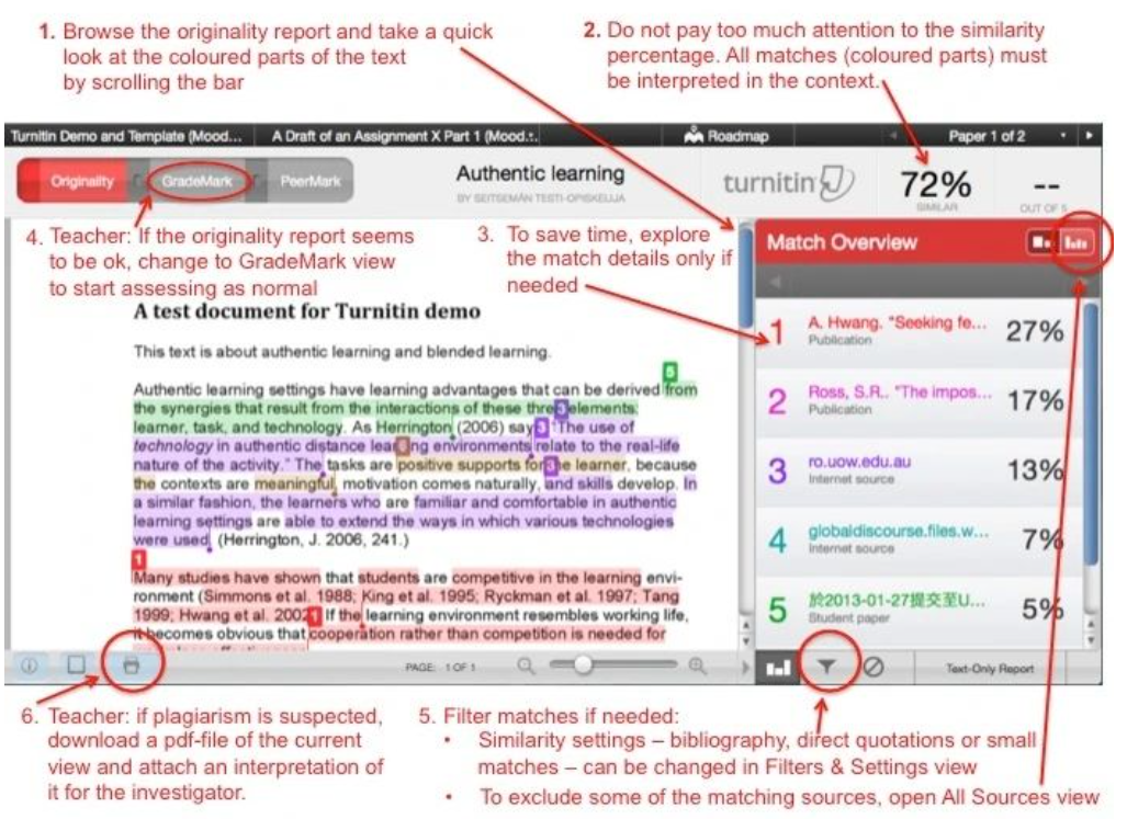 使用Turnitin查重的话,会收到一份报告,上面会把所有疑似重复的语句标上颜色,并且注明重复文本的来源,帮助大家快速找到与其重复的文本,总的还会有一个Index,是文本中总共被查出重复的地方的比例。