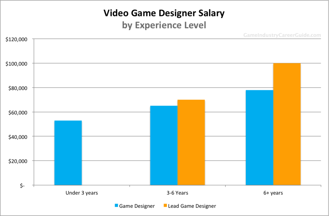 那我们以视频游戏设计师为例,低于3年工龄的薪资有近6w美金,而之后可高达10w美金。