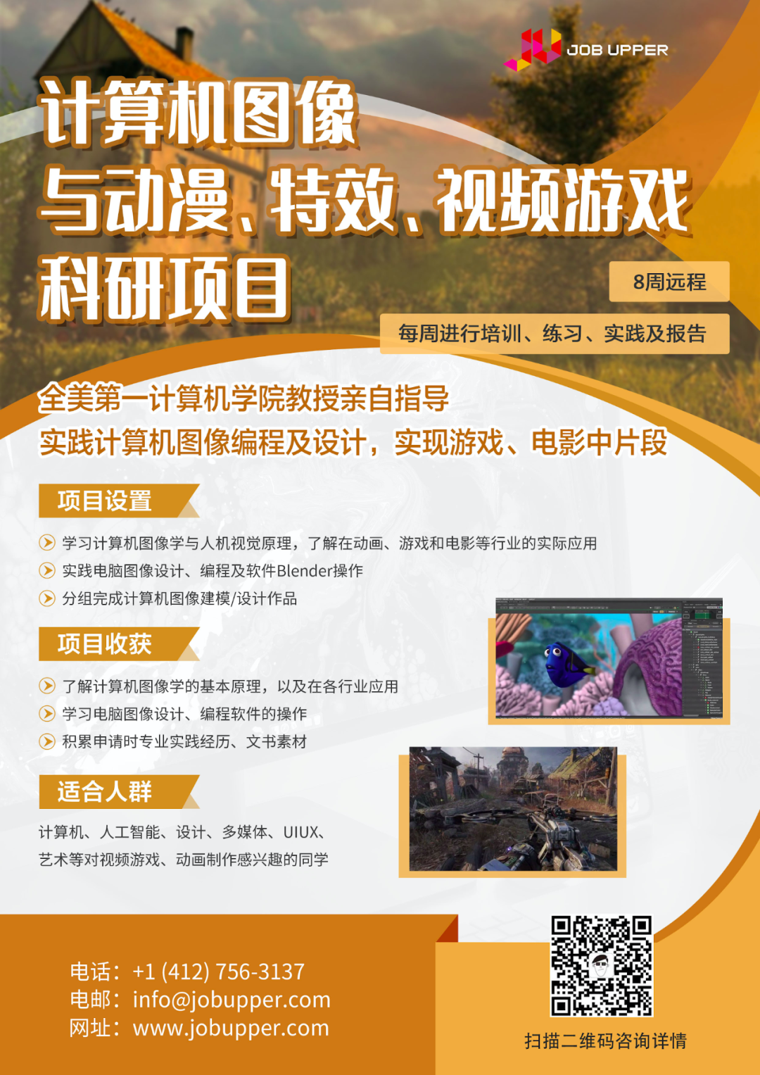 如果你是计算机、人工智能、设计、多媒体、UIUX、艺术等专业的同学,或者对视频游戏、动画制作感兴趣,那么务必要抓住难得的机会,师从全美第一计算机学院教授,开启第一个计算机图形作品,为未来的专业申请,进入动漫、特效和视频游戏产业,实现0的突破!