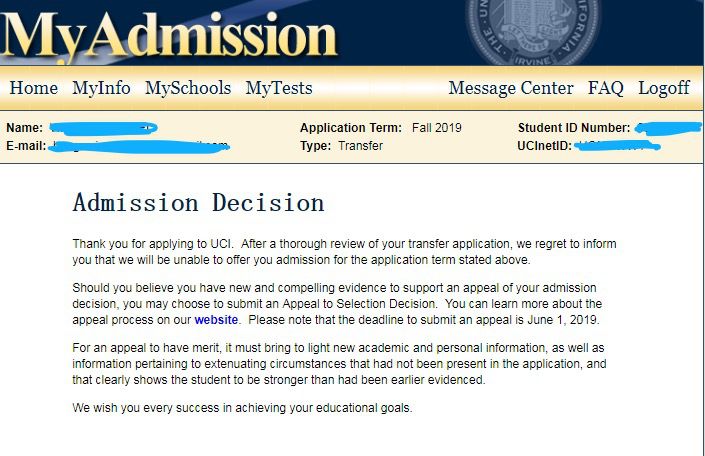 再来看看UCI的拒信就比较简洁明了,我们不能给你offer,但是关于appeal学校直接给出了链接和日期!!这样的拒信,你不appeal就是你自己不努力了噢!?