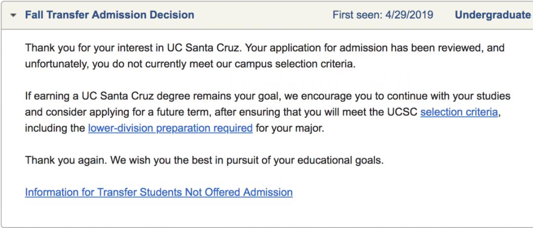 UCSC加州大学圣塔克鲁兹分校的拒信,虽然霸气,实在让人不禁想怼回去! “you do not currently meet our campus selection criteria.” 今年厚仁所接的appeal中就有很多UCSC的同学,申请老师们都逐一列出了学生水平与学校要求相符合的地方来给学校appeal!(让你说我不合适)