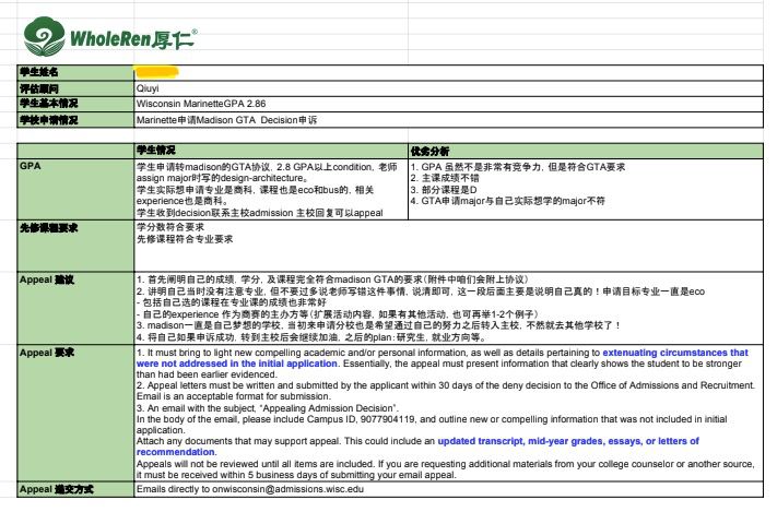 这份appeal report是厚仁申请老师Qiuyi老师根据学生的背景情况,与针对的关键内容做出的,学生在Wisconsin某分校就读,申请Wisconsin Madison的转学,只申请了这一所学校,悲剧之后非常绝望,但她找到了厚仁的Qiuyi老师帮她认真剖析,列出每一个可以针对拒信做出努力的地方,并帮助她积极与学校沟通,终于Appeal成功,拿下offer!