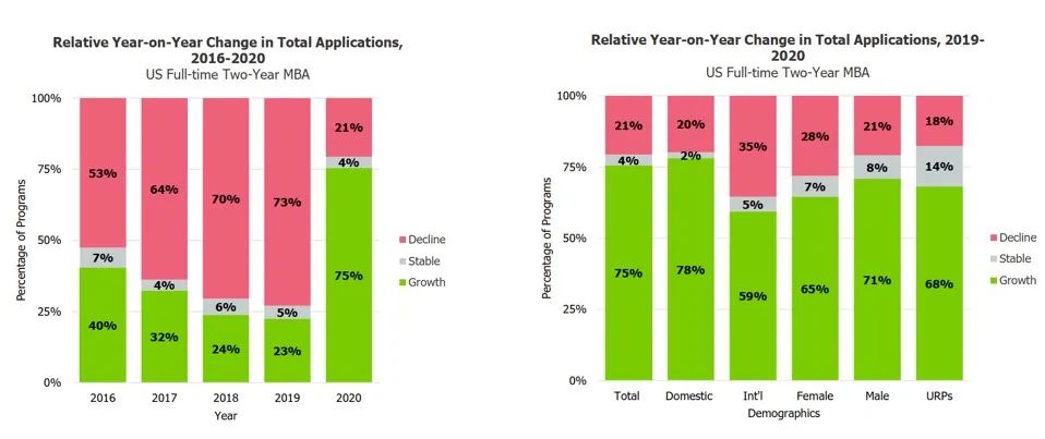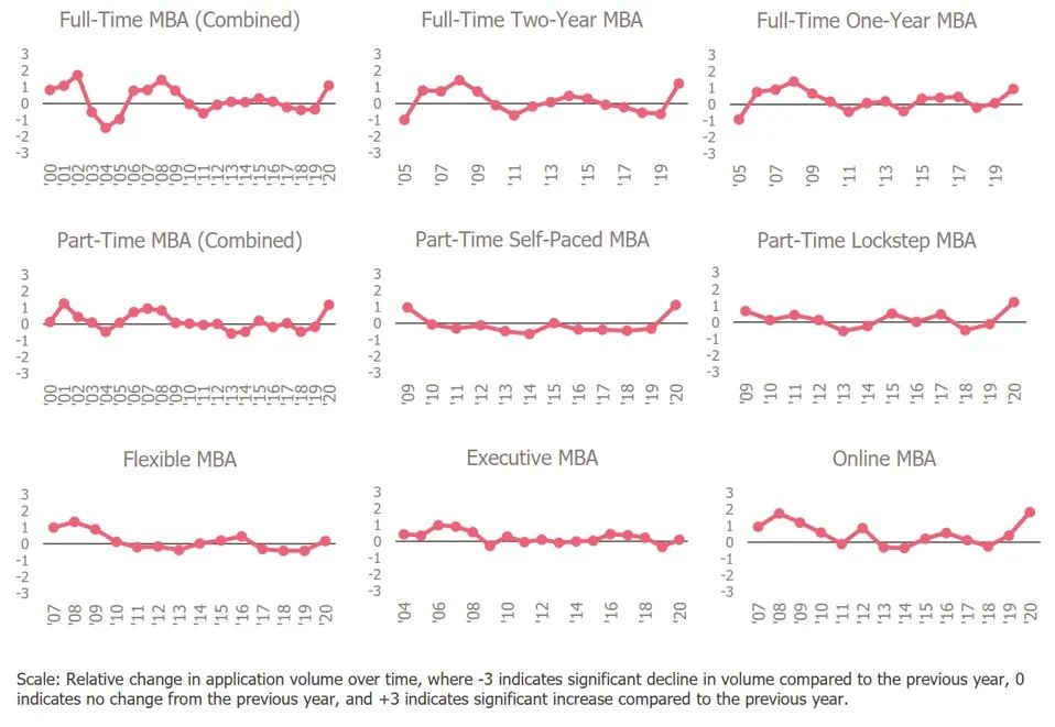 因此这也是近五年来,商学院申请人数首次暴涨,2020年以前,攻读商学院的学生一直处于持续下降的趋势——在2019年,北美商学院申请人数更是直接下降了7%。