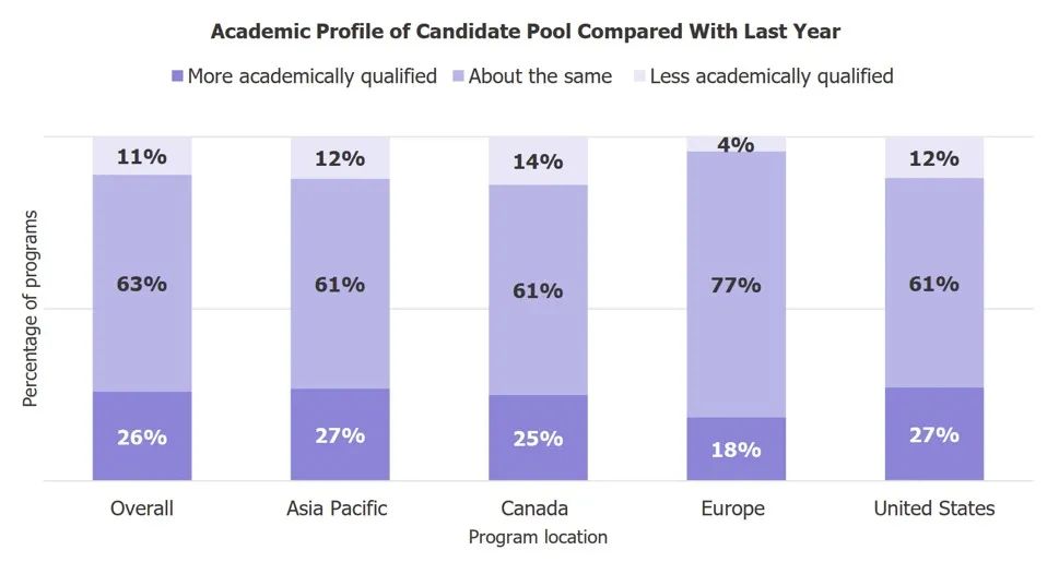但从地区来看,各个竞争地区的申请增长率存在差异。今年有67%的美国大学商学院项目申请量增加,而加拿大和欧洲商学院申请量增加的项目占比均超过了70%。
