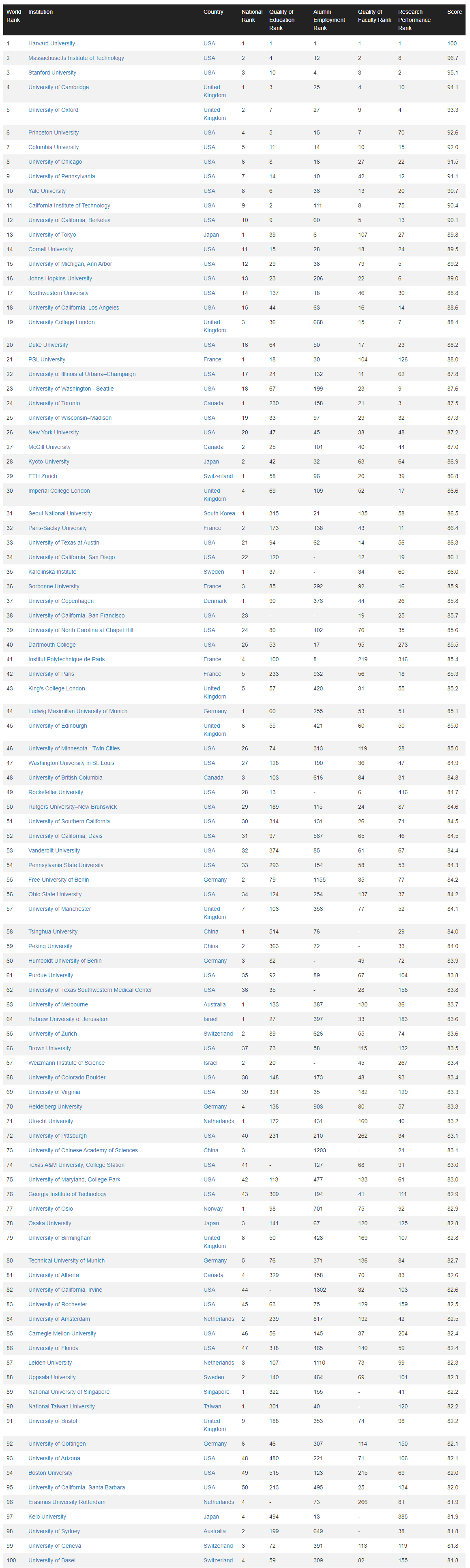 美国一直在前10名中稳占8名,在前2000名中有347名美国大学中名列前茅。哈佛大学、斯坦福大学和麻省理工学院是世界上论文被引用次数最多的大学,也是常年的TOP 3。此外,常春藤盟校的8所学校都跻身了今年的前70名。