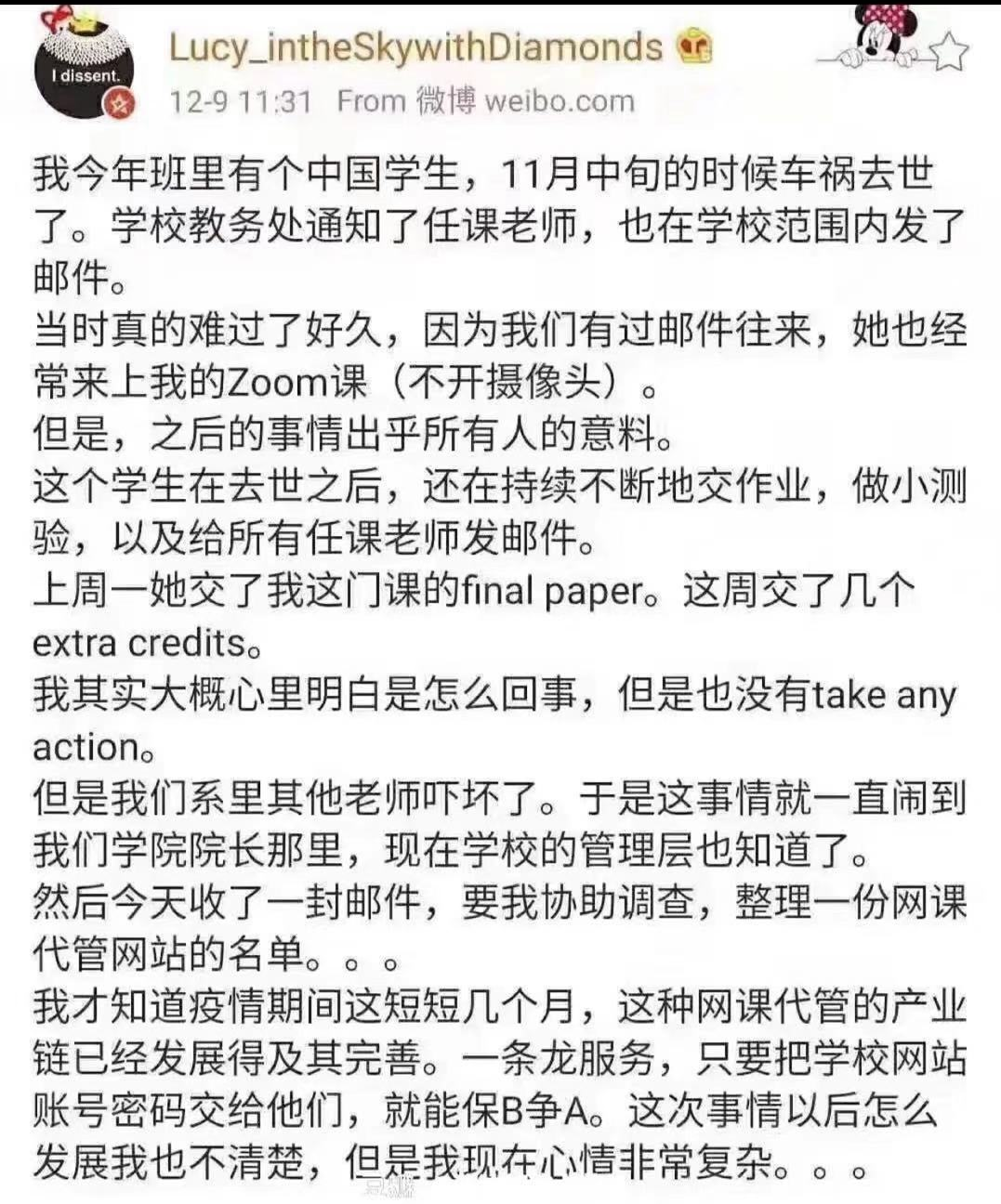 根据上面同学的陈述,去世的学生还交了一门课的final paper,学校已开始调查。这不难猜出是和在美国非常猖狂的灰色产业链—商业作弊有关。其实商业作弊一直都是留学中存在的很大问题,这是一种以营利性为目的帮助别人作弊的不法行为。不管在哪个国家,商业作弊都在慢慢渗透进各个学校。通常我们接触到的商业作弊现象大多为论文代写、考试代考、网课代上等。在留学生圈子里,商业作弊现象屡屡发生,却一直得不到有效控制。尤其在疫情爆发后,学校纷纷改为网课学习,不少人更是抓住了这个机会忽悠留学生们购买代写代考。