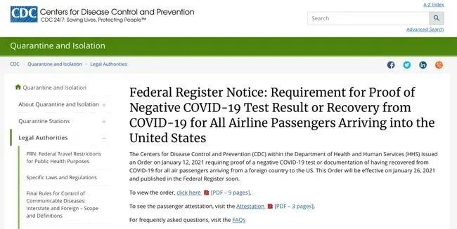 1.1月26起入境美国的国际旅客,包括美国公民,提供登机前3天内的新冠检测报告(阴性报告或者康复证明文件);