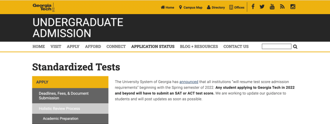 佐治亚理工在官网宣布,对于2022年春季及之后入学的学生,恢复SAT/ACT成绩作为必要申请材料,该部分学生在申请佐治亚理工时必须提交标化成绩,具体细则将会在近日发布。