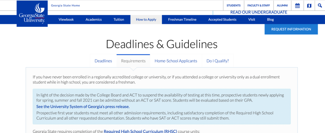 GSU目前还尚未对佐治亚大学系统的更新做出响应,官网显示2021春季和秋季申请入学依然沿用Test-Optional政策。