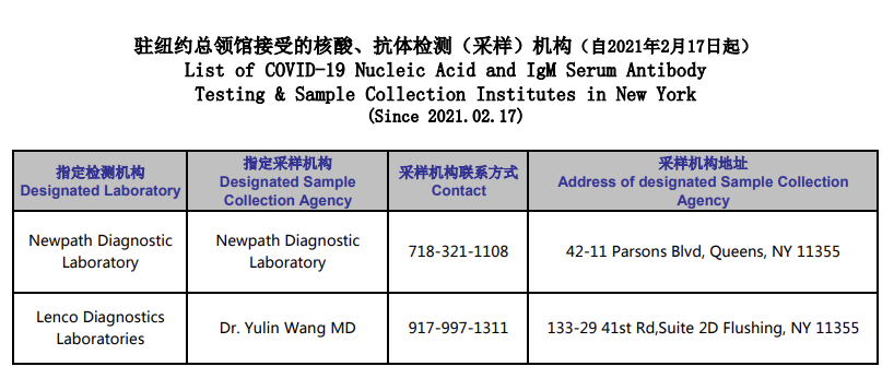 3、登机前48小时内分别在起飞地(纽约)两家不同的指定检测机构各进行1次核酸检测。
