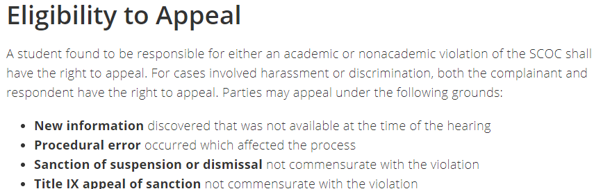 如果学生对处理结果有异议,则可以在5天内向Director of Student Conduct and Community Standards递交Student Code of Conduct Appeal Form提出书面申诉。申诉理由需以下列因素为基础: