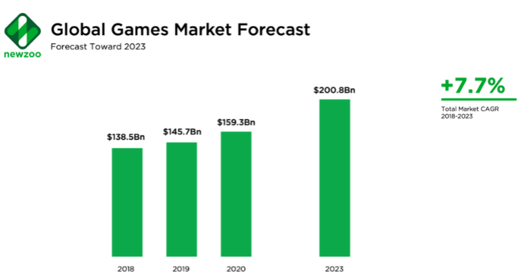 ● 2019年全球视频游戏产业的市场规模为1000亿美元,2023年会到达2000亿