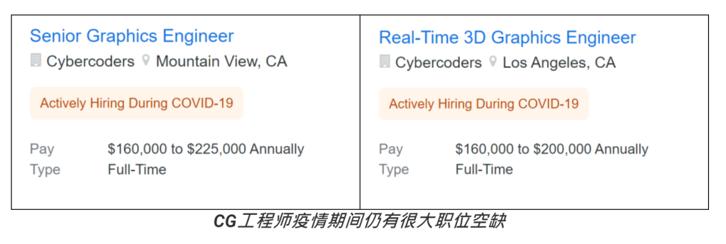 此角色基于团队,使视频游戏开发人员可以与其他图形艺术家,作家和开发人员一起工作。电子游戏开发人员一直在努力更新游戏,以推出新版本,添加更多组件或修复错误。这样的职位在最疫情最严重的时期,也仍然有强劲的职位需求,一个普通studio的CG工程师,或者3D Graphic 工程师,年薪达到了16-20万美金。