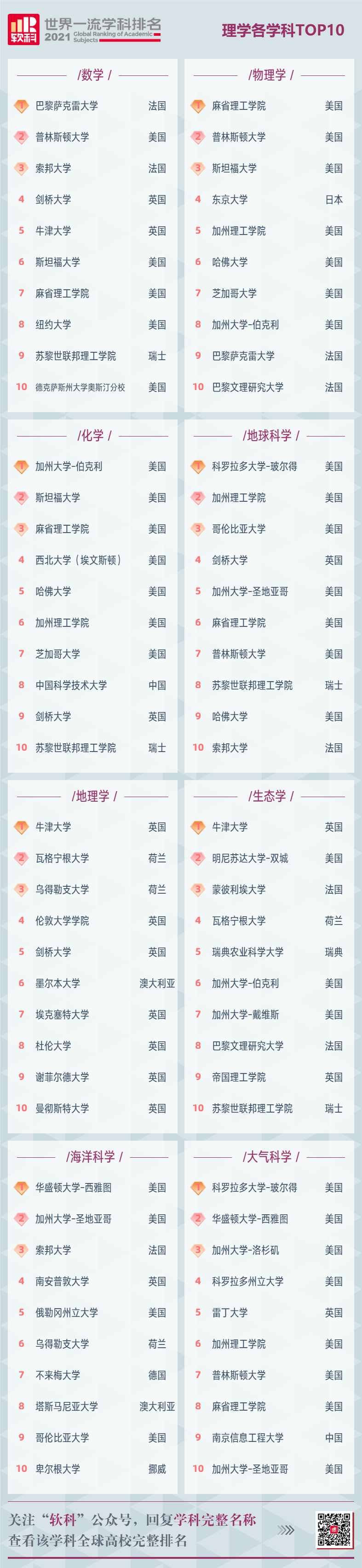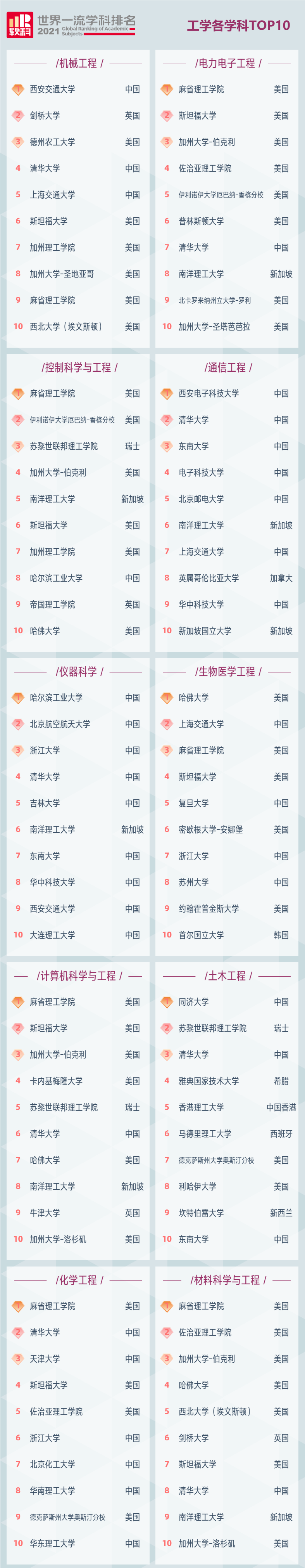 这是一份以理工科为主的大学学科排名,特别是对工科学科划分的比较细,很多在其他世界排名中找不到的工科学科排名,在这里可以找到。