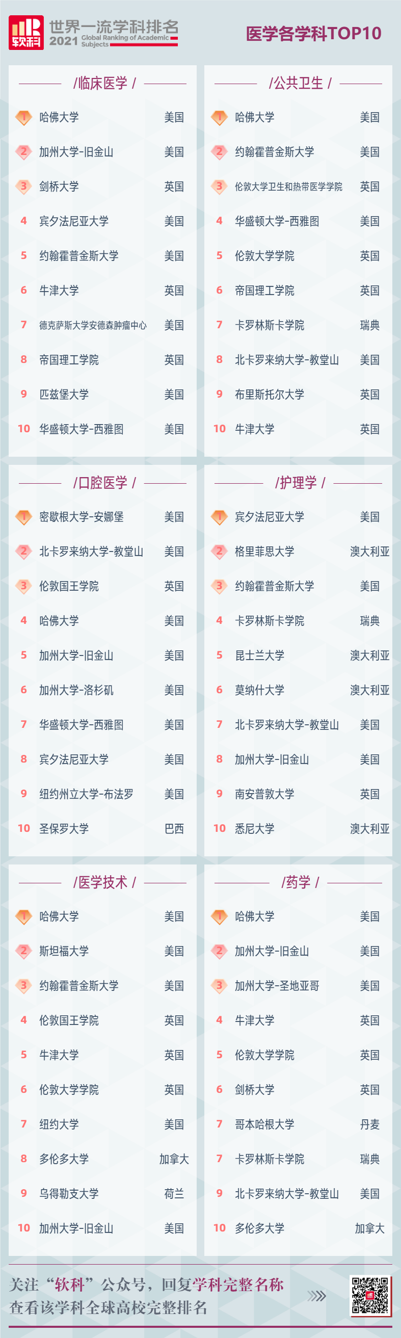 2021年的软科学科排名覆盖54个学科,涉及理学、工学、生命科学、医学和社会科学五大领域。