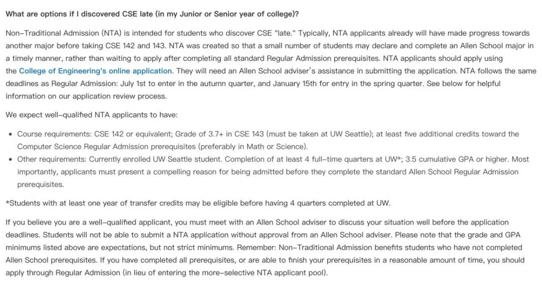 可以从截图看到,华大进CS专业的要求太高,除了有课程方面的要求:总的GPA需要达到3.5+;完成专业课程CSE142或者143,成绩达到3.7+;同时递交进专业的申请。这个要求对于学生的成绩及专业方面的要求是比较高的。对于本身在校内GPA不高的学生短期之内实现不了,而且案例当中的学生这时已经大三,现在如果还不进专业,本科毕业还需要多久才能读完呢?