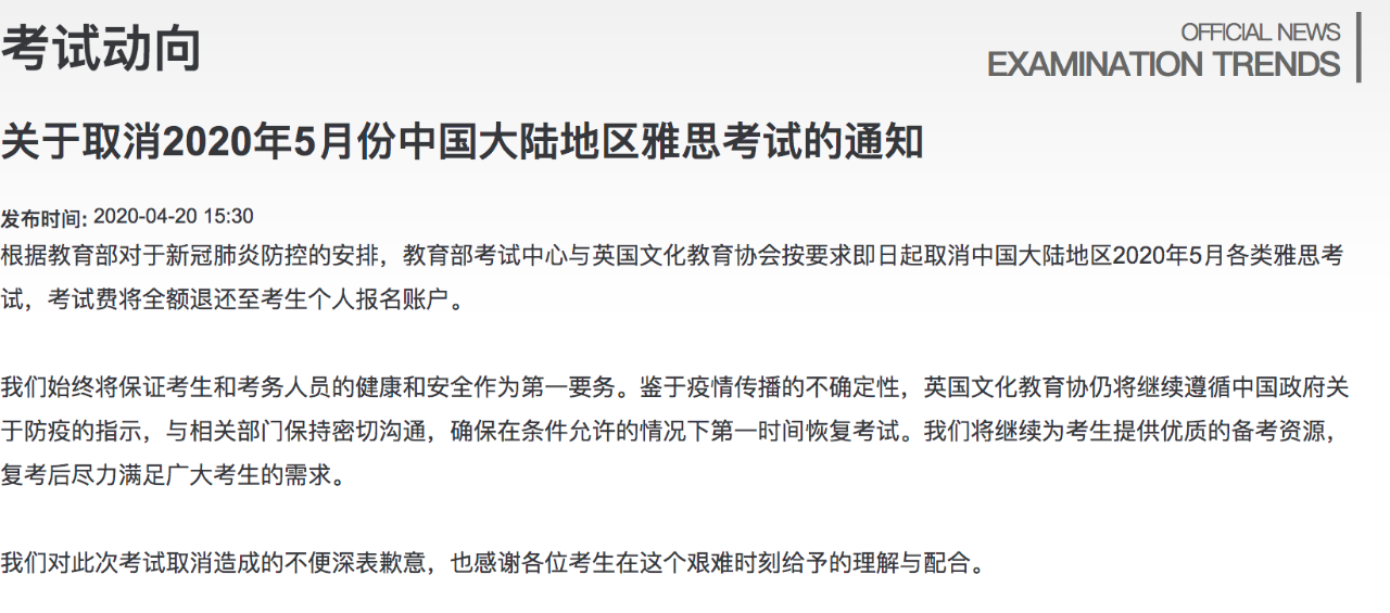根据教育部对于疫情防控的安排,教育部考试中心与英国文化教育协会按要求即日起取消中国大陆地区2020年5月各类雅思考试,考试费将全额退还至考生个人报名账户。