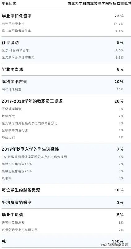 今年的排名因素,在毕业后负债率方面增加了两个因素,所以减少了SAT、ACT ,高中年级排名,以及校友捐献因素的占比。