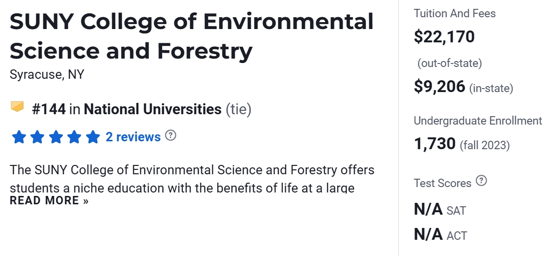 在2025 年USNews美国大学排名中,ESF排名第144位。