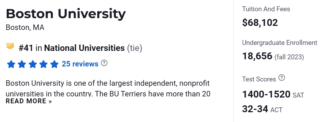 在2025年USNews美国大学排名中, 波士顿大学排名第41。